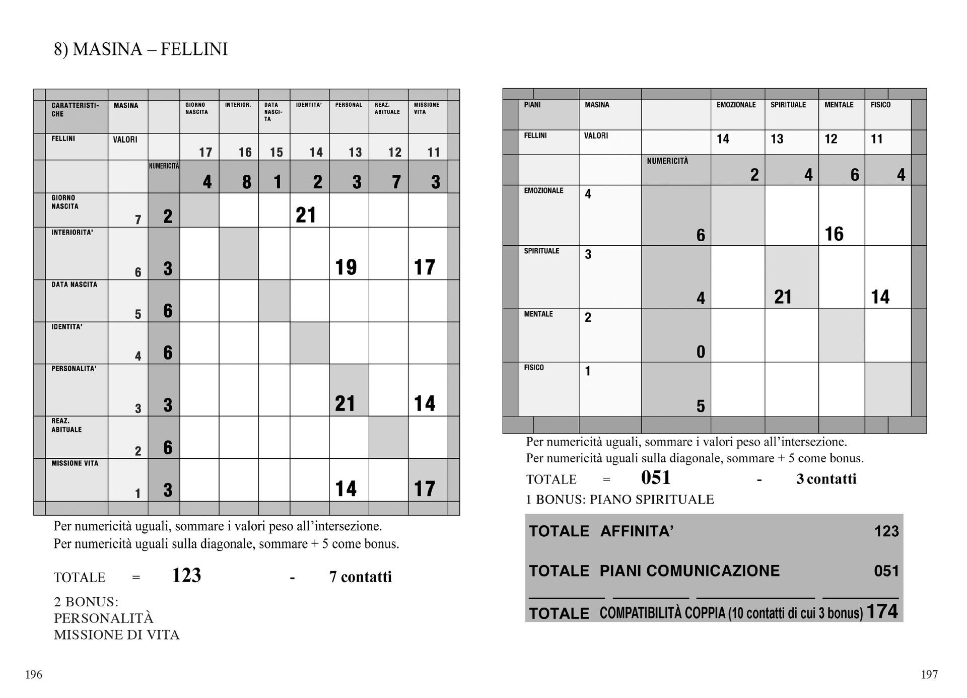 Il primo rappresenta le relazioni tra le sette Caratteristiche Numerologiche principali della coppia, l’Affinità, come visto in precedenza. Il secondo rappresenta le relazioni tra i quattro Piani Numerologici di Comunicazione. Ad ogni criterio, Affinità o Piano, è stato assegnato un valore/peso. Quando due qualsiasi criteri della coppia coincidono, i valori vengono sommati. A questa somma è aggiunto un premio o bonus (+5), se i criteri che coincidono sono identici (contatti sulla diagonale).